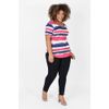 Blusa feminina plus size em tecido crepe com linda estampa de ondas coloridas. A peça dispõe de gola redonda, mangas curtas e barra arredondada. Pode ser usada para compor looks diversos para o dia a dia.