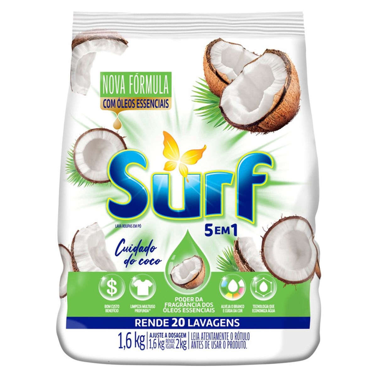 Lava Roupas Sanitizante em Pó Surf 5 em 1 Cuidado do Coco 1, 6 Kg